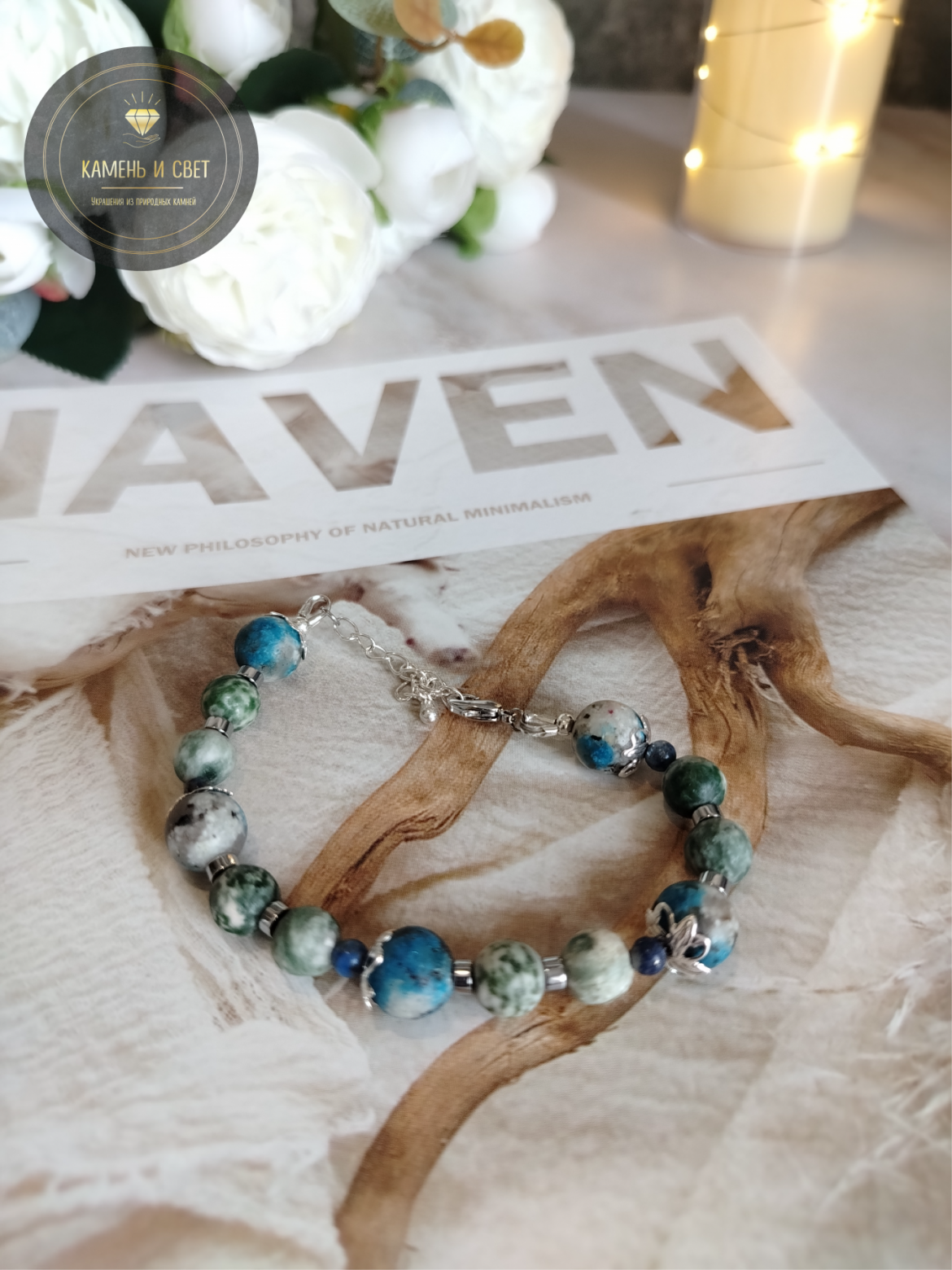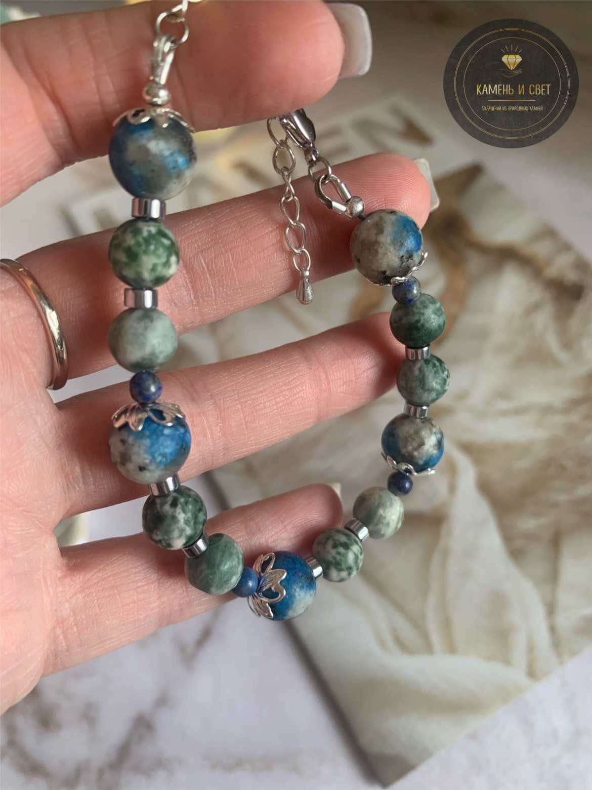 Закажите браслет «Четыре мира» из натуральных камней Жадеит, Яшма, Лазурит, Гематит. Ручная работа, гармоничное сочетание минералов, быстрая отправка.